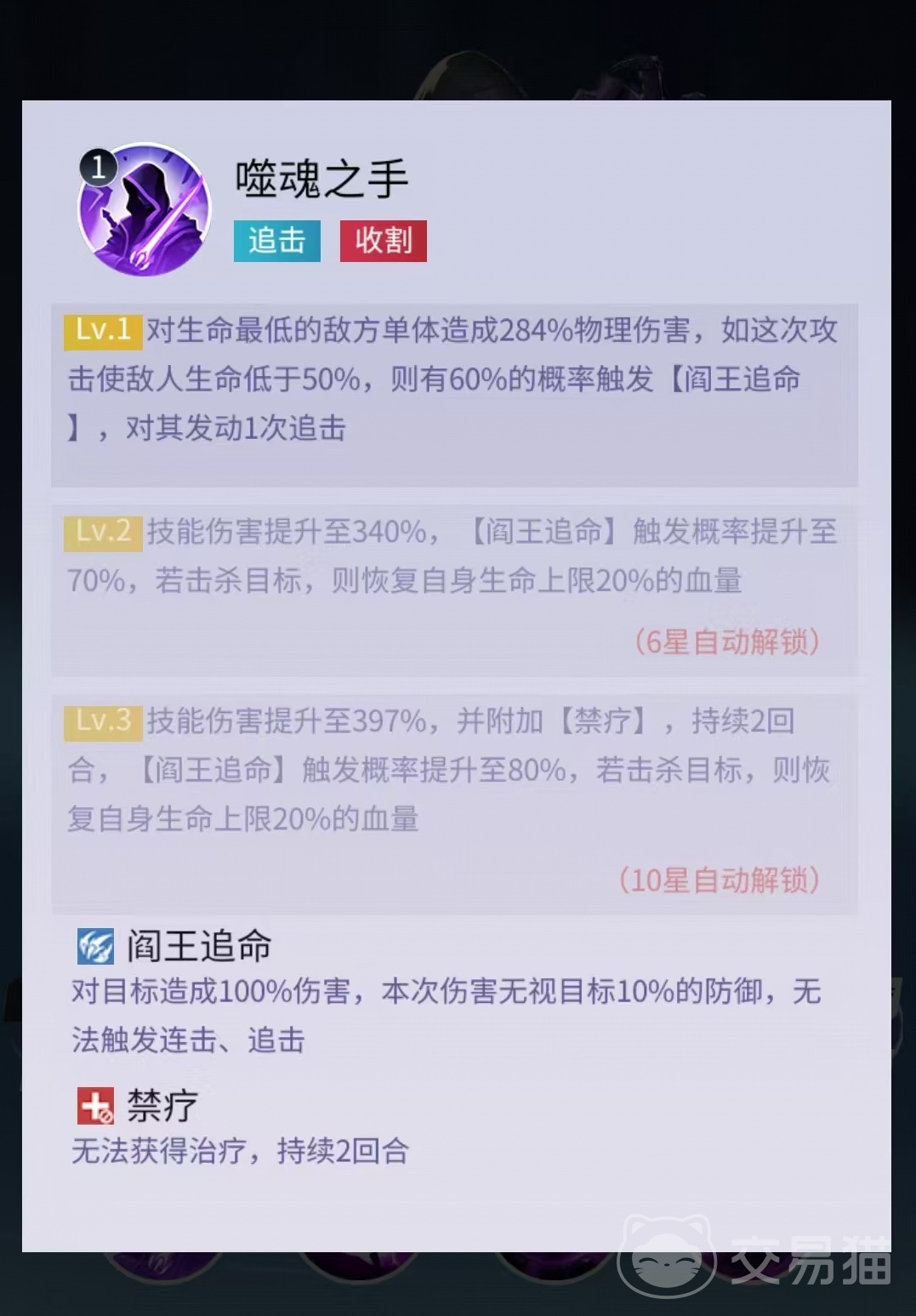 三技能提供基础属性增益,提升自身攻击力、最大生命值及暴击伤害;终极技能“九幽之力”则具备持续成长特性:每次普通攻击均可叠加1层效果,每层提供3%攻击力加成,上限为10层;同时有概率使目标陷入中毒状态,每回合持续损失生命值。该技能显著强化阎罗王中后期的输出稳定性与压制持久性。