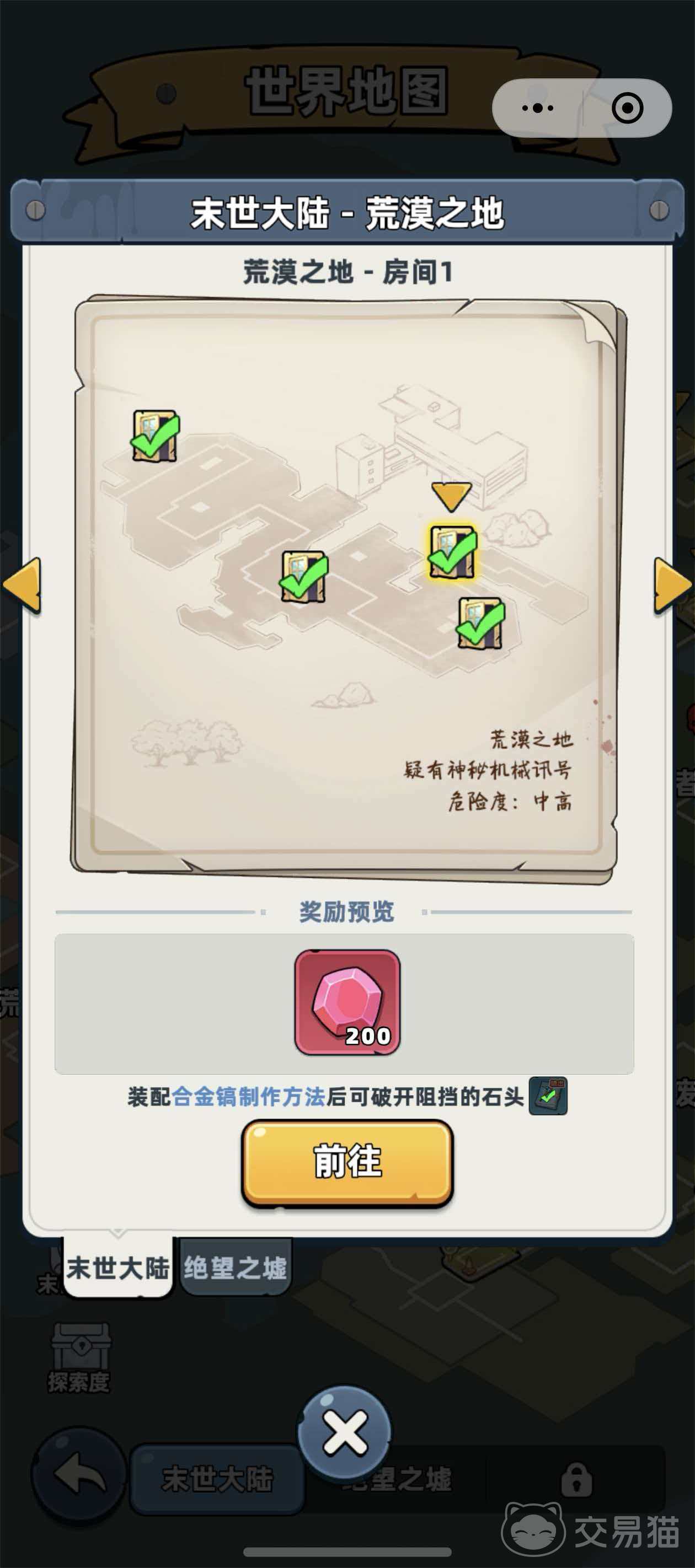 荒漠之地的钥匙并非散落于野外,而是集中分布于特定房间内。玩家需主动进入结构化房间开展探索。定位方式如下:点击界面右上角地图按钮,在地图左下角切换至“探索度”视图——该模式将完整显示荒漠之地所有已知可探索房间位置。点击任一房间图标,角色将瞬移至该房间入口。需特别注意:每个房间均设有最低战力门槛,若当前战斗力低于要求值,系统将提示“战力不足”,无法成功进入或完成探索流程。