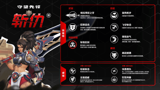 斩仇是一位手持巨剑的近战型英雄,她的技能组旨在提供高机动性、控制能力和强大的近战压制力。武器帕拉希尼之刃是一把挥舞着巨大刀刃的双手巨剑,主要以大范围的近战攻击为主。
