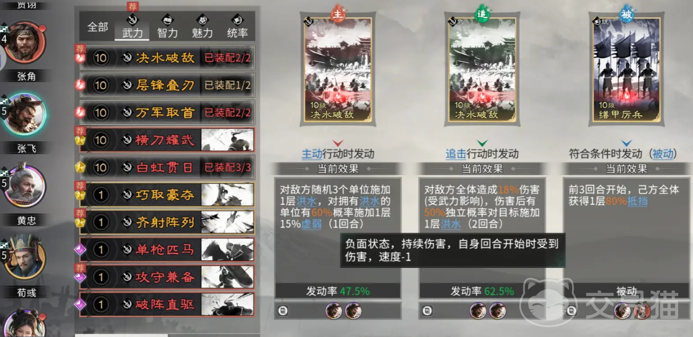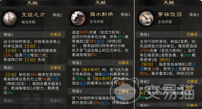 在天赋配置上,黄忠必带“穿杨饮羽”,这是整套体系的输出引擎;张飞锁定“据水断桥”,通过施加虚弱状态扩大受击伤害倍率,反向强化黄忠暴击收益;荀彧则依赖“王佐之才”,不仅提升自身四维成长,更以持续增益支撑全队属性上限。三者天赋形成闭环:虚弱→易伤→暴击增幅→定点秒杀。