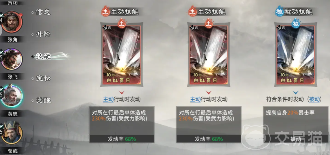 技能组合方面,黄忠主推“白虹贯日”,该技能兼具主动释放与被动触发双重机制:基础效果可提升暴击概率,配合“穿杨饮羽”后,对敌方后排单位的单体伤害倍率显著跃升;当黄忠晋升至“炼彩”品质时,“白虹贯日”可转化为主动技能卡,实现双主动技能协同释放,进一步叠加暴击加成,使秒杀稳定性与容错率同步提高。