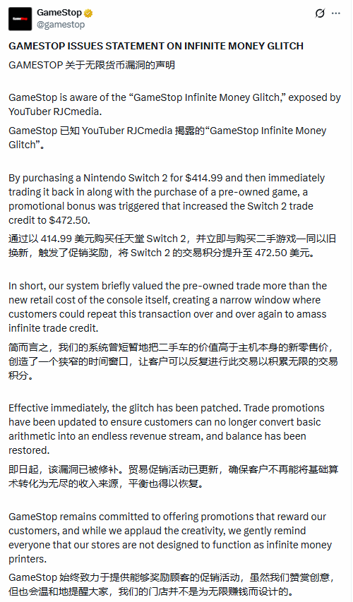 对此,GameStop 官方今日紧急发布声明,宣布该漏洞已完成修复: “我们意识到了由 YouTuber RJCmedia 曝光的无限套利漏洞。简单来说,我们的系统曾短暂地让二手回收价值超过了新机的零售成本,创造了一个极小的窗口,让客户可以循环交易来累积点数。目前该 Bug 已修复,我们已更新促销逻辑,确保客户不再能将‘基础算术’转化为‘无限收入’。我们欢迎大家的创意,但要温馨提醒各位:我们的商店不是为了充当‘无限印钞机’而设计的。”