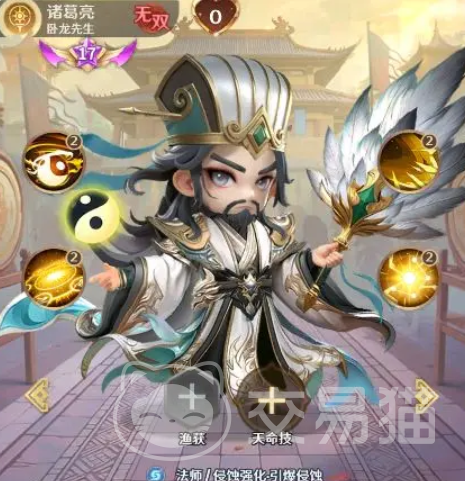 首推武将为诸葛亮——混沌阵营核心法师型输出。其绝技可对全体敌人造成高额法术伤害,并同步施加“阵营增益叠加”效果。被动机制支持多段连锁引爆,持续触发范围爆炸伤害;同时具备治疗能力,可依据当前我方血量最低单位,恢复其一定比例生命值。该设计使其兼具AOE压制、持续伤害构建与关键续航三重功能,在混沌队中承担节奏发起与资源转化双重职责。