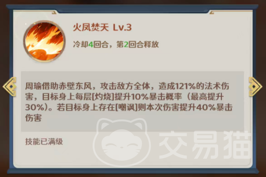 主动技“火凤焚天”拥有4回合冷却,需自第二回合起方可释放。该技能作用于全体敌方单位,造成121%法术伤害,并依据目标当前所受嘲讽层数提供暴击率加成:每层嘲讽提升10%暴击率,最高叠加至30%;若目标已存在嘲讽状态,则直接获得40%暴击率加成。此机制使其成为周瑜爆发输出的核心手段,尤其适配高嘲讽覆盖率的战斗场景。