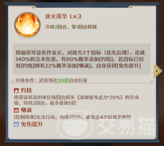 核心技能“业火莲华”为周瑜首回合必发技,可将琴音转化为业火进行定向打击,优先锁定敌方后排两名单位,造成140%法术伤害。该技能附带80%概率施加1层灼烧;若目标已处于灼烧状态,则额外触发22%概率施加1层嘲讽。同时,周瑜自身获得1层免伤效果。当星级提升至30星后,该技能自动强化:灼烧每回合造成周瑜攻击力20%的真实伤害,最多可叠加5层,总持续伤害量显著提升。所附加的嘲讽效果属于强控类状态,被控目标无法行动,持续至承受4次攻击后解除,对前排敌将具有极高压制效率。