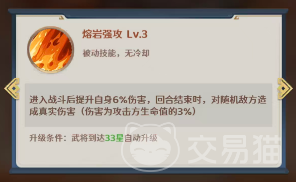 被动技“熔岩强攻”无冷却限制,每回合均可触发。战斗开始时即提升周瑜6%全伤害;回合结束时,对随机一名敌方单位造成真实伤害,数值为周瑜当前生命值的3%。该效果在33星后进一步强化,真实伤害比例提升,确保周瑜在持久战中始终保持可观的额外输出能力。