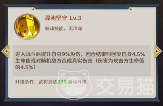 被动技【混沌坚守】提供稳定生存增益:战斗开始即获得9%免伤效果;每回合结束时,额外恢复自身最大生命值4.5%。该恢复效果与一技能的5%生命恢复独立计算,可叠加生效。此外,该被动还会随机选取一名敌方单位,对其造成相当于张飞当前生命值4.5%的真实伤害——这意味着张飞生命上限越高,该被动触发的真实伤害数值越可观,形成“越肉越痛”的正向循环。