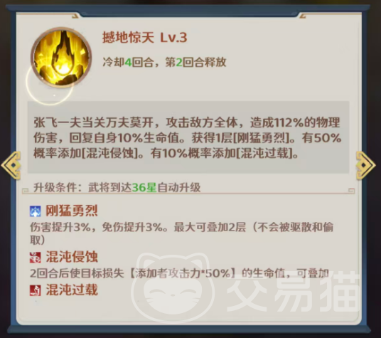 三技能【撼地惊天】为群体爆发技,对全体敌人造成112%物理伤害,并立即回复自身最大生命值10%。释放后,张飞获得一层【刚猛勇烈】状态。该状态具有多重战略价值:每层提供3%最终伤害加成;拥有50%概率使下一次攻击附带【混沌侵蚀】效果;另有10%概率触发【混沌过载】,进一步压制敌方生存能力。当【刚猛勇烈】叠至两层时,该状态不可被驱散或偷取,保障后续输出稳定性与控制延续性。