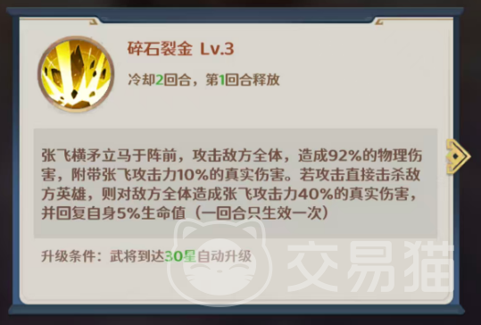 一技能【碎石炼金】是张飞的核心主动技。该技能对敌方全体造成92%物理伤害,并额外附加相当于自身攻击力10%的真实伤害。若本次攻击直接击杀任一目标,则以该目标所在位置为基准,再次施放一次等同于张飞攻击力40%的真实伤害。此连环真实伤害具备极强的斩杀与补刀能力,尤其适用于敌方单位血量低于阈值时精准触发。每次成功击杀后,张飞还可恢复自身最大生命值5%,该效果每回合仅生效一次,但配合其高基础血量,可显著降低对治疗角色的依赖,提升队伍整体容错率。