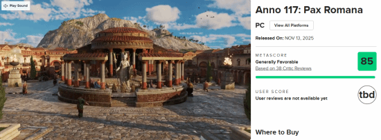 《纪元117:罗马和平》是育碧策略模拟类新游,将于11月13日发售,首发支持中文配音。目前游戏的M站媒体评分已经解禁: