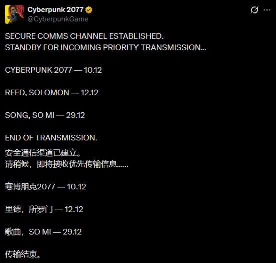 曾报道《赛博朋克2077》官方发布了一条意味深长的帖子,暗示可能将在2025年12月10日(也正好是游戏五周年)公布重大情报。