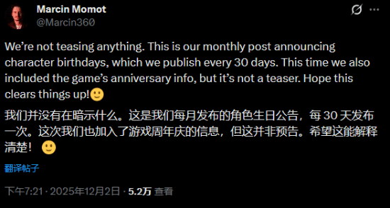 最终,CDPR的全球社区总监Marcin Momot不得不亲自出面澄清,称其只是某种类似“例行公事”的发布,并无预热宣传计划。他解释称:“我们什么都没有暗示。这只是我们每月发布的角色生日公告,每30天发一次。这次我们顺便加入了游戏周年纪念的信息,但这不是预告。希望这能解释清楚!”