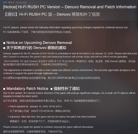 游戏今日在Steam推送了新一期的更新通知,官方表示游戏的D加密功能即将于北京时间2026年1月15日23:00结束,不过,即便D加密被移除之后,游戏自身的防篡改机制仍将保持有效,但不会影响正常游玩。