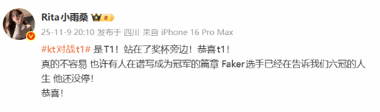 赛后,英雄联盟官方解说Rita也发文表示:“是T1!站在了奖杯旁边!恭喜t1!真的不容易 也许有人在谱写成为冠军的篇章 Faker选手已经在告诉我们六冠的人生 他还没停!恭喜! ”