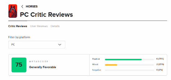 而IGN给予了《Horses》70分,认为本作是一款极具冲击力的第一人称恐怖游戏。尽管存在任务重复和指引不清的瑕疵,但它讲述了一个令人心惊肉跳的故事,注定让你久久难以忘怀。