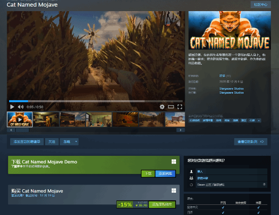 近日,由Stargazers Studios制作的心理恐怖游戏《莫哈维之猫》现已在Steam发售,国区售价42元,首发享85折优惠,35.7元即可入手,折扣持续至12月19日。此外,游戏也支持Demo试玩,感兴趣的朋友不妨在购买前先体验一下。