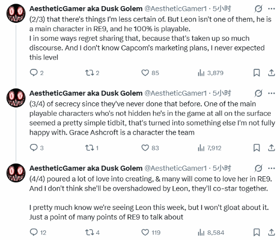 “在某种程度上,我后悔透露了这一点,因为它引发了太多讨论。而我不了解卡普空的营销计划,我从未预料到这种保密程度,因为他们以前从未这样做过。一个并非隐藏、表面上显然会登场的主要可操作角色,这原本看似是一个相当简单的信息点,却演变成了让我不太满意的局面。格蕾丝·阿什克罗夫特是团队倾注了大量心血创造的角色,许多人会在《生化危机9》中喜欢上她。我不认为她会被里昂的光环遮盖,他们将共同担任主角。”