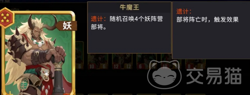 第三套主打「妖族召唤不屈体系」:石矶、牛魔王、铁扇公主构成核心闭环。牛魔王召唤妖族部将入场,铁扇公主在妖族单位阵亡时为全体妖族提供攻击力加成,石矶则赋予牛魔王不屈效果,使其召唤能力持续在线。三者协同形成“越战越强”的滚雪球效应,后期输出成长曲线极为陡峭。