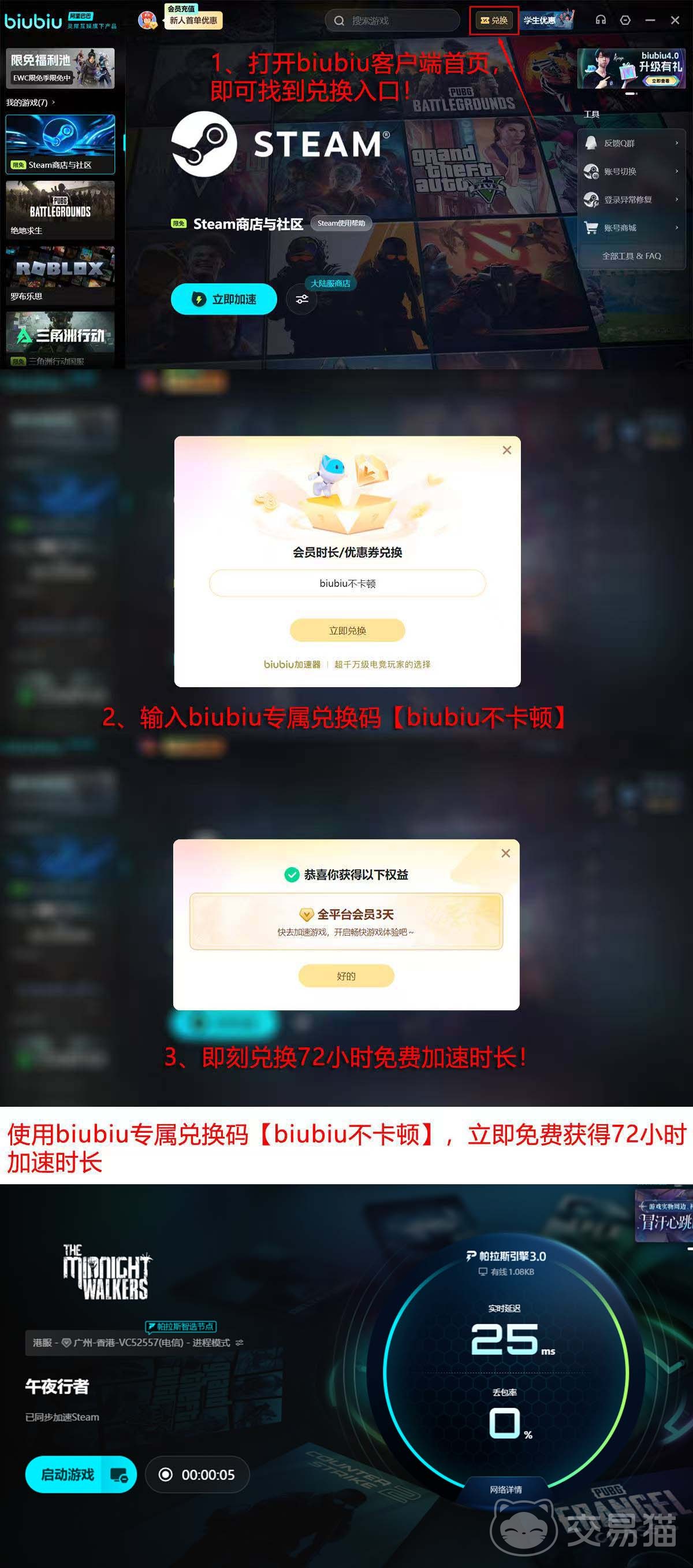 对于尚未尝试的用户,可通过注册获取基础体验时长,再结合指定口令兑换额外使用权限的方式完成全周期测试。具体流程为:完成账号注册后自动获得24小时试用资格;随后在客户端首页“兑换”入口输入口令【biubiu不卡顿】,即可追加72小时服务时长,累计达96小时。