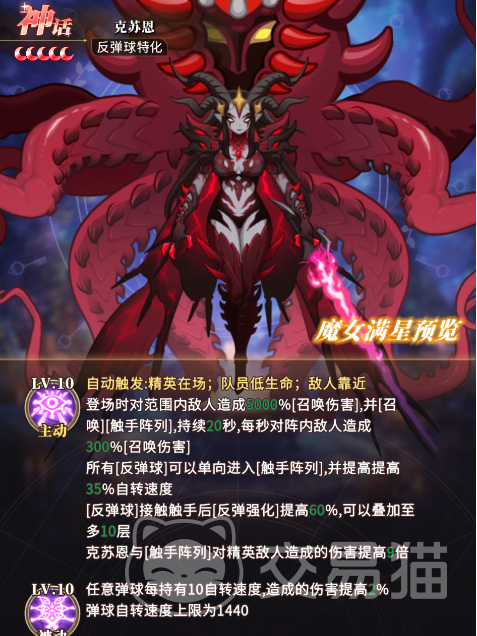 第三位为克苏恩,专精反弹球协同体系。入场时发动召唤伤害,并布设「触手阵列」——所有反弹球进入该区域后,自转速率即时提升;触碰触手更可强化反弹力道。其被动赋予弹球恒定10次/秒基础自转速率加成:大型球默认自转速为360,反弹球为720,克苏恩可进一步提升二者实际转速,从而放大反弹类输出收益。