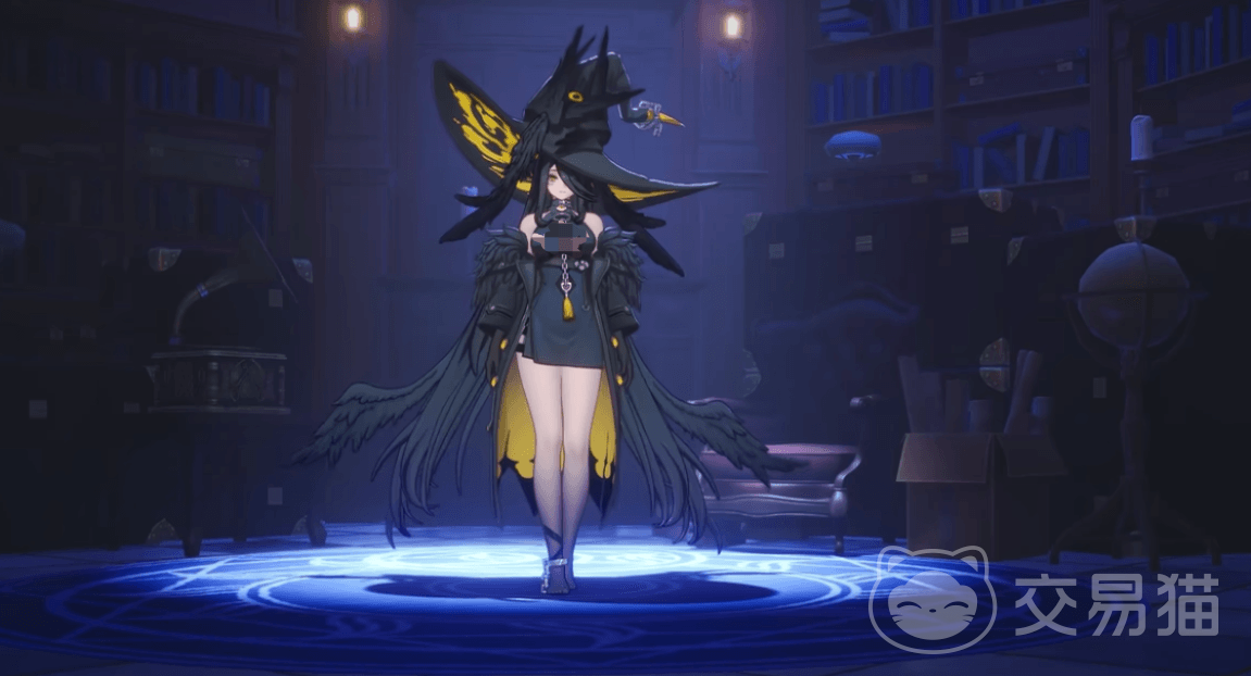 角色整体视觉语言高度统一:通体采用深黑色调,头戴复古女巫帽,肩颈处装饰鸦羽纹样;颈部佩戴一枚悬浮式异瞳挂饰,强化其不可测的灵能属性;胸前垂落金属锁链,双足佩戴断裂镣铐——这些细节并非单纯装饰,而是与其背景故事深度绑定的关键符号,暗示其曾受禁锢却挣脱束缚的过往,也侧面印证其高阶战斗素养。