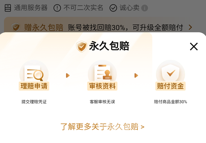 账号安全性是买家最核心的关切之一。针对“ purchased account reclaimed by original owner(原号主找回)”这一风险,已在商品页显著位置标注账号是否支持二次实名认证,并对部分优质账号提供“永久包赔”服务。购买含该保障的商品后,如遇异常锁定、无法登录等情况,用户仅需在订单详情页提交售后申请,附上游戏错误提示截图及相关凭证,平台将在1–3个工作日内完成审核并启动赔付流程。基础赔偿比例不低于订单金额的30%,符合平台特定条件(如提供完整换绑记录、无违规操作证明等)者,还可申请全额退款,切实提升交易确定性与资金保障水平。