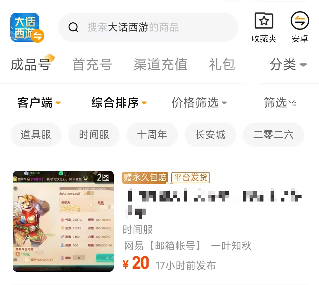 扫码下载APP 下载 点击下载APP大话西游这个游戏在目前的游戏市场不算特别热门,很多交易平台都是搜索不到的,而平台就拥有这类游戏的账号,而且定位区分得很明确,可供玩家们仔细挑选,而且账号的内容都会通过图片的方式进行展示,避免了虚假宣传的情况,同时还附带了一个安心购的服务权益,如果账号出现特殊情况的话,官方都会进行赔付,而且平台严选正品游戏商品,专属官方验号服务全面覆盖超百款热门游戏,全程确保验号信息真实可查、完整无缺、精准无误,切实筑牢交易安全防线,要使用平台的话,推荐安卓用户通过上方按钮下载,而ios用户则可以直接到官网使用哦。