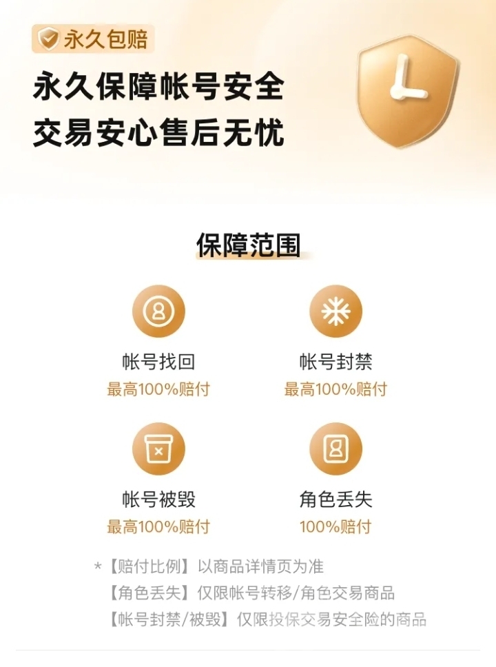 平台更是由阿里巴巴灵犀互娱参与建设的,也是当前行业里唯一提供永久包赔机制的平台。安心购服务包含的永久包赔,如果交易完成之后的账号在约定的周期被冻结、恶意找回等,经过客服核实,就能启动最高全额赔付的补偿,稳稳的守护大家的交易安全。