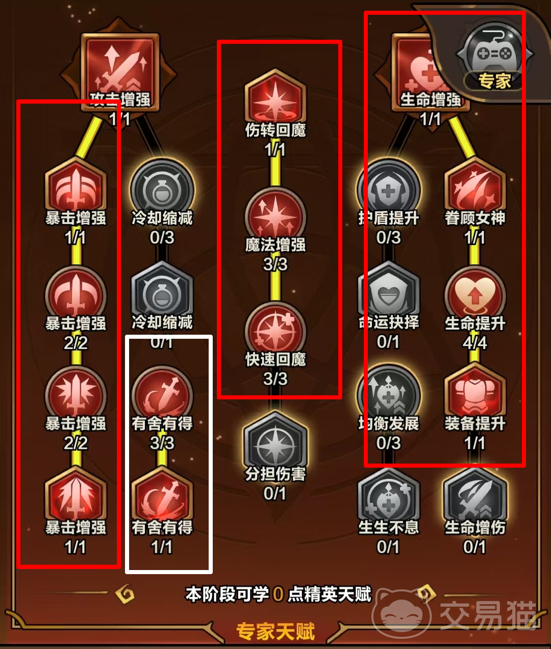 核心路径聚焦中间红色区域全点满。左侧白色区域暂不分配点数,待中期完成【魔法天赋】最左列全部节点后再开启补点。若后期资源紧张,可将中间底部三项天赋回退,将点数集中投向提升魔法值上限与恢复效率的关键节点,确保技能循环持续性优先于次要属性加成。