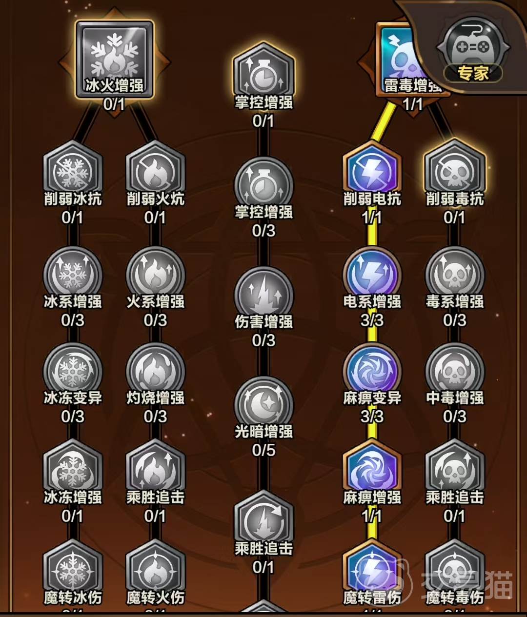依据主力技能所归属的元素属性进行定向强化:火、电、毒、冰系技能优先激活对应元素分支;光系、暗系及魔法弹系则统一聚焦于中间纵向列天赋。其中,魔法弹类技能虽属魔法范畴,但应选择物理增强方向以实现最大收益。