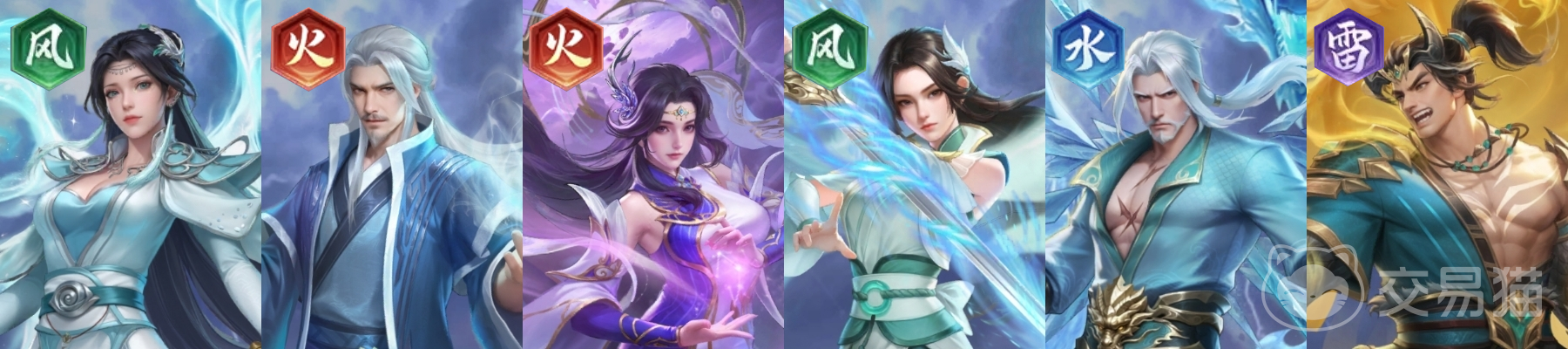 角色构成:云韵(风) 药老(火) 玄衣(火) 纳兰嫣然(风) 海波东(水) 熊战(雷)
