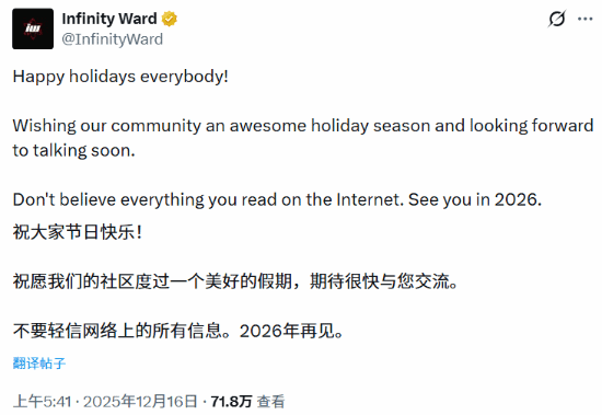 “祝大家节日快乐!愿我们的社区享受美好的假期,期待不久后与各位交流。不要轻信你在互联网上看到的一切。2026年见。”