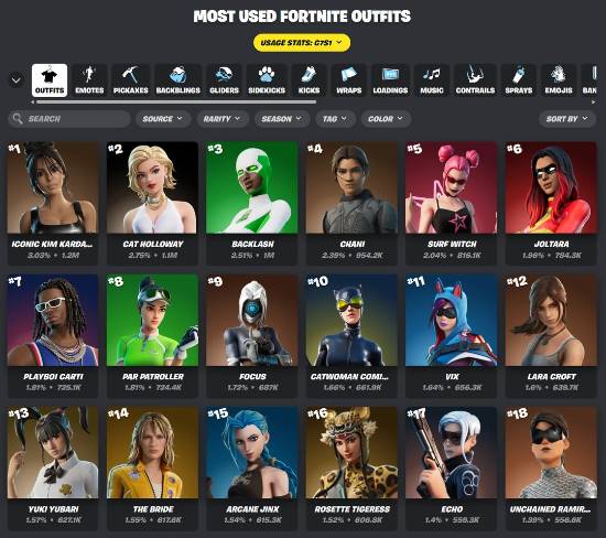 根据Reddit玩家分享的Fortnite.GG统计数据显示,金·卡戴珊的“偶像系列”皮肤已成为第七章第一赛季绝对的人气冠军,表现堪称“断层式”领先: