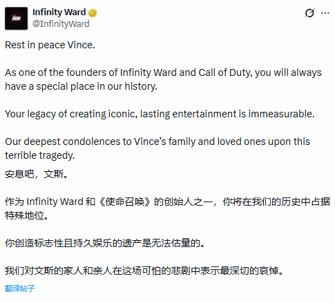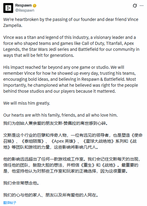 Respawn工作室: “Vince是这个行业的巨人和传奇。他是一位远见卓识的领导者,他所塑造的游戏将影响整整几代人。比起游戏,我们更怀念他每天鼓励大胆创意、信任团队的人格魅力。”