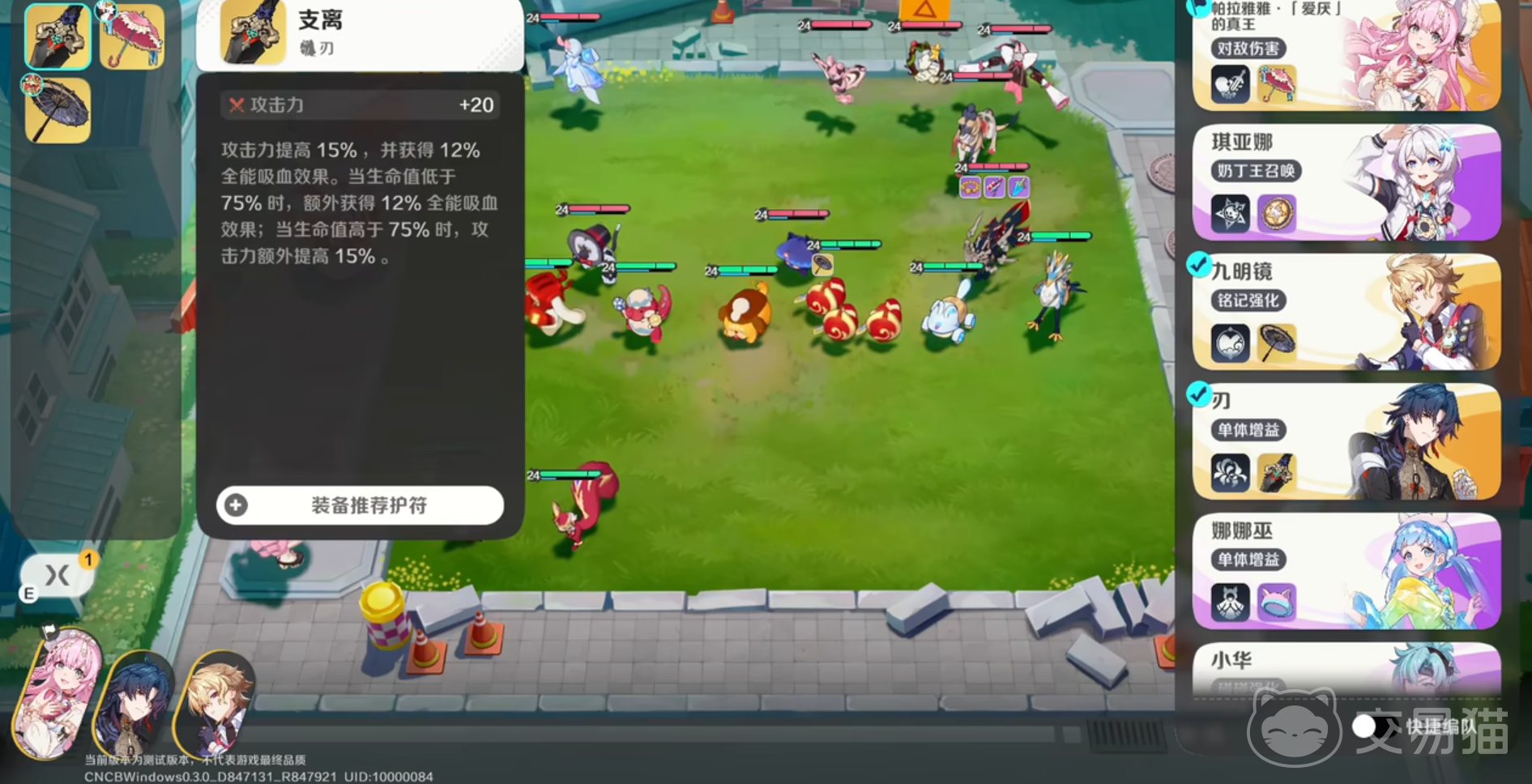 配合法则使用的另一关键组件是专属护符【支离】,其提供三项增益:15%攻击力提升、12%全能吸血效果;当佩戴者生命值高于75%时,全能吸血效果翻倍至24%。该护符与刃的生存向定位高度契合,能有效缓解持续作战中的资源压力。需注意的是,吸血收益存在明显阈值——低于75%生命值时仅享受基础12%,因此推荐将其配置给具备自愈手段、或常驻高血量区间的主力精灵(例如自带回血技能的大C),以最大化收益稳定性。若搭配前排高耐久单位使用,可进一步放大其站桩输出效率与抗压能力。