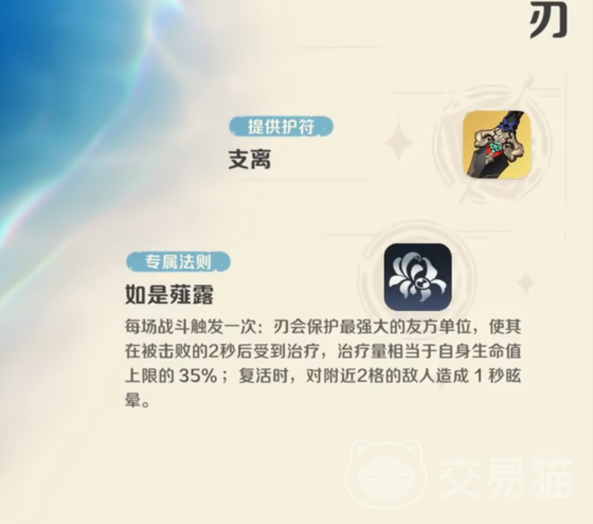 刃的核心机制为其专属法则【如是薤露】:每场战斗仅触发一次,自动锁定我方进阶等级最高的精灵,在其被击败后2秒内恢复相当于刃自身生命上限35%的生命值;复活生效时,对周围2格范围内所有敌人施加1秒眩晕效果。该机制不依赖手动释放,全程自动判定,且目标唯一指向“最高阶精灵”,无论其处于前排承伤位或后排输出位,均可获得等效“复活 控场”双重保障。此设计大幅降低关键单位暴毙风险,并在团战节奏中创造宝贵反打窗口,综合功能性与战略价值均属当前版本顶尖梯队。