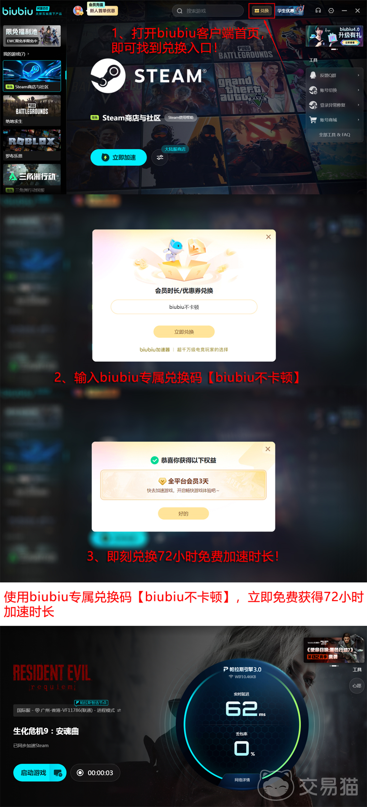 新用户注册后可直接获得24小时免费加速时长;完成注册后,输入兑换码【biubiu不卡顿】还可额外领取72小时加速权限。该兑换码支持首次使用,且不限新老账号,每位账户限用一次。