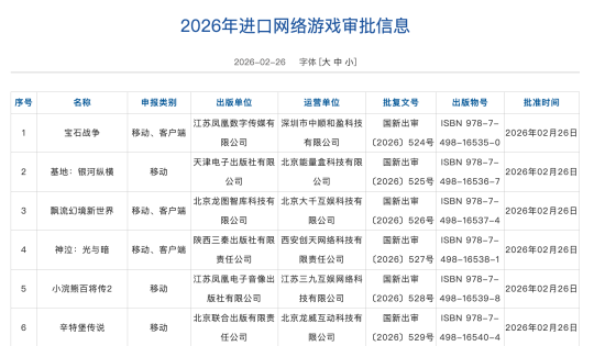 2月27日,国家资讯出版署正式发布2026年2月网络游戏审批信息,本次共146款国产网络游戏获得版号,另有6款进口网络游戏获批,6款游戏完成审批信息变更。其中值得关注的有:腾讯《雪中悍刀行之世子多娇》、莉莉丝游戏《塔塔冒险队》、4399《绒爪行动》和《造梦秘境》、游卡网络《三国杀:极速》、雷霆互动《五行游》等。