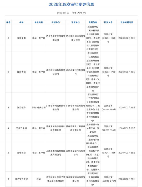 游戏审批变更信息: