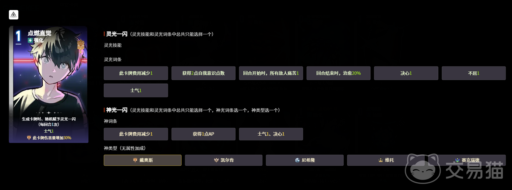 游戏中卡组体系划分为角色专属牌组与全局共用牌组两类。角色牌组受角色等级、装备及属性直接影响,构成战斗核心输出框架;共用牌组则在每局中动态刷新,涵盖业火种子、中立卡牌与怪物卡牌三大类型。“点燃直觉”属于中立卡牌中的关键强化型组件,其唯一生效机制为:每当有新卡生成时,随机赋予其中一张“灵光一闪”效果。该能力每回合仅触发一次,作用对象限于单张新生卡牌,但所附加的增益具有显著战术价值,是构筑高容错率牌组的重要辅助选择。